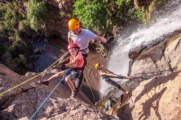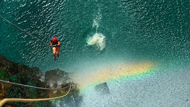 Итак, мы предлагаем спуск снеплингом по водопадам Двора, 20м и Джилабун (Гильбон), 42м. Спуститься можно будет либо по самим водопадам, либо рядом - в облаке брызг. Заканчивается спуск в проточной воде. Желающие могут не спускаться снеплингом, а сразу подойти к воде снизу, искупаться, поплавать, сфотографировать спускающихся снизу... Но вы многое потеряете! Снеплинг по водопадам - это нечто особенное! Бонус от TOFI: по водопаду Джилабун можно будет спуститься больше чем 1 раз!